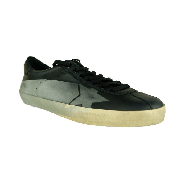 Golden Goose men’s sneakers in black leather with silver painted portion, printed star logo, 100% leather, rubber sole. Made in Italy